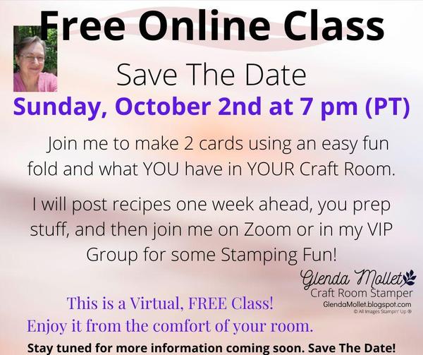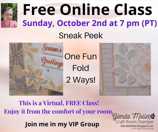 FOLD CLASS! I can't give you many details yet, except for the following: Date: Sunday, October 2nd Time: 7 pm till we are done (Pacific Time) Place: Online in my VIP facebook group and on Zoom Price: Absolutley FREE I will create 2 fun fold cards and share the recipes with you. You prep what you need to create along with me, using what you have in your craft room This class is open to anyone, you just have to be a member of my VIP Group. That is where the Zoom link and the recipes will be found. Come and join in on the fun! Here's the link to my VIP Group, it's FREE and it's FUN! Lots of great things happen in this lovely group. https://www.facebook.com/groups/1148180145565229 STARTER KIT PLUS - GET EVEN MORE FREE PRODUCTS! It’s a fabulous time to join Stampin’ Up! You will get even MORE FREE products in your customizable Starter