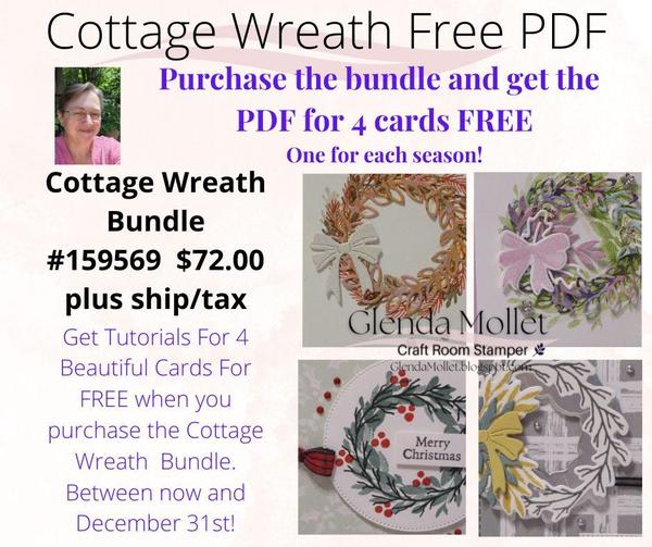 WREATHS CARDS! Only available until December 31st, and only FREE. I had so much fun with the Cottage Wreaths bundle that I thought I would offer a FREE tutorial for 4 cards! There are a number of ways YOU can get this FREE tutorial PDF. Please note, these are not video tutorials, they are step by step written tutorials. - 1 - Purchase the Cottage Wreaths bundle (shown below) using my Host Code and get the tutorial for FREE