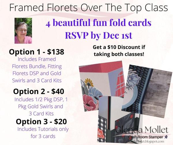 Options 4 and 5 are also available world wide. Stamp with me In Person at 1 pm or Virtually at 6:30 pm (Pacific Time) CLICK HERE to register now and reserve your spot. THE FRAMED FLORETS OVER THE TOP FUN FOLD CLASS - Wed. Dec 28th RSVP By December 1st Although this class is not until the end of December, registration is open now through December 1st because I am not sure how long the designer paper and Gold Swirls will be available to order. This class is an advanced class for Stampers who enjoy creating fun folds. It also includes