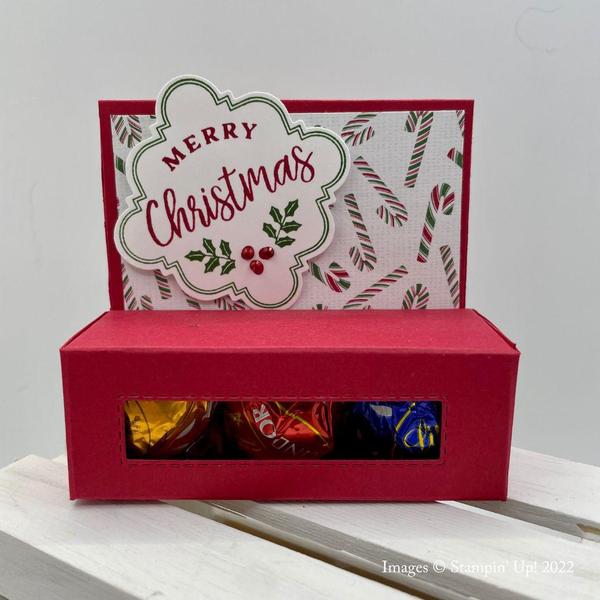 tutorials for you this week. The first one is a stunning white and red glimmer paper Christmas card using the Merriest Moments stamp set, dies and hybrid embossing folder. The second one holds 3 Lindt chocolates and is perfect for gift giving this holiday season, or all year round. The picture of each project is below, then click the Link In Pink below each picture for the downloadable PDF. Enjoy! Is your wish list longer than your