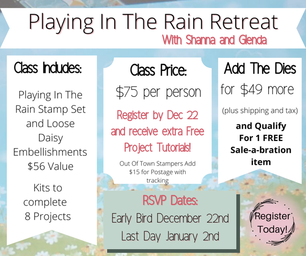 dies for only $49 more AND qualify for one Level 1 Sale-a-Bration Item! You can also add on the Raindrops Embossing Folder for only $12 The class will be held Virtually with Glenda and Shanna, and In Person with Glenda, on Saturday, January 28th. (please note In Person and Virtual will happen at the same time). Registration is open NOW until January 2nd. EARLY BIRD REGISTRATION - Register by December 22nd and we will send you extra FREE project tutorials to use with this
