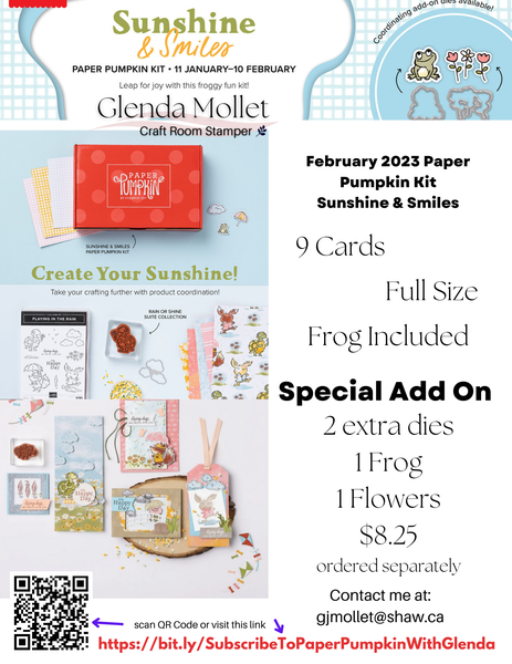an Add On too! Sunshine & Smiles Dies (Available for purchase starting 11 January, while supplies last) Item number: 162486 $8.25 CAD This add-on includes: - One coordinating frog-shaped die: 1-1/8" x 7/8" (2.9 x 2.2 cm)