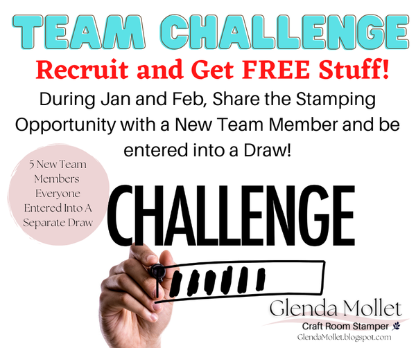 CHALLENGE FOR YOU!Do you like getting FREE stuff? I know I do! Would you like to earn some Downline Dollars? This Challenge is for YOU then. Â During the months of January and February (during Sale-a-Bration) anyone who gets a new Recruit (Team Member) will be entered into a super duper Draw! Our Canadian DDM, Gen Ko, has some awesome products to give us Leaders for sharing with our Teams and holding a Challenge. I have no idea what the prizes are until I receive them, but they are going to be fabulous! If you don't want to recruit under you, then you can still be entered into the draw by bringing a New Team Member to our Family. They can sign up under any of us in the Team, just make sure you let me know and I will put Your name and the Team Leader's name into the