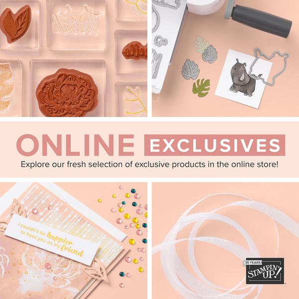 you would like to participate, and you are a member of our Team Group on facebook CLICK HERE to go to the post, and add your name, address, birthday and stampaversary date in the comments.     ONLINE EXCLUSIVES AVAILABLE FOR PRE-ORDER NOW  Online Exclusives are all about the future of shopping and selling. And a great opportunity for new experiences! You won’t find these products in any catalog, which means you can reach out to your customers and share fresh, never-before-seen products to spark their creativity and expand their crafting collection (and yours!). All from the convenience of the online store. As part of our new product release strategy, Online Exclusives allow you to better utilize digital resources and platforms in an ever-changing world. And we’ve provided several resources in the Marketing Toolkit for you to share with your customers. This new strategy also helps us respond more quickly to relevant trends, your needs, and the needs of your customers. So make sure you stay up to date with our Online Exclusive product releases throughout the