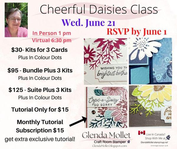 Here's the line up for the colours. You can choose one or both of the colours each month, so you ONLY GET WHAT YOU WANT! May - Bubble Bath, Berry Burst June - Azure Afternoon, Lost Lagoon July - Lemon Lolly, Misty Moonlight August - Pecan Pie, Lemon Lime Twist September - Blueberry Bushel, Pretty Peacock There are only 4 new colours, so September has 2 returning colours. AND ..... Register for BOTH "CLUBS" and get another free gift from me at the end of the 5 months. Please note: colours each month could change based on supply availability. If something is not available to order, alternative colour and products will be substituted. CLICK HERE to register for the New Colour "Club" TODAY! JUNE CLASS AND MONTHLY TUTORIAL SUBSCRIPTION Cheerful Daisies ~ RSVP by June 1st I am so excited to host a Class using the brand new Cheerful Daisies bundle, on Wed. June 21st, and it will be the Monthly Tutorial Subscription for May as well! Here's all the details about the class: - Option #1 - $30 - 3 Card Kits Plus In Colour Dots