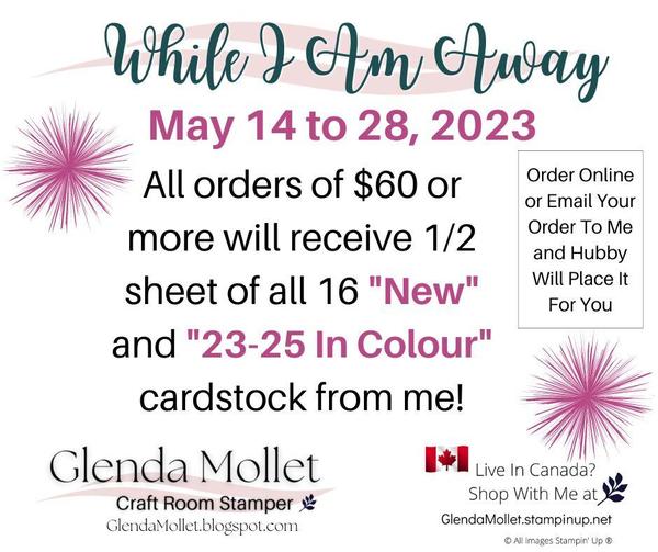 life. I will be away May 14 to 28, but don't worry, if you follow any of my social media platforms, you will still get content with value. AND - I have a "While I Am Away" ordering special. Check out the information below to see how you can get some FREE STUFF! But I won't be doing my weekly newsletter until I am back. Hope to see you soon, In My Craft Room! Have a great week! WHILE I AM AWAY ORDERING
