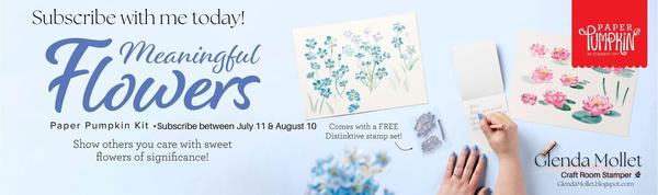 PUMPKIN KIT Meaningful Flowers Grab yours before August 10th.   The August kit includes:  · 8 cards; 4 each of 2 designs · 8 coordinating envelopes · 1 photopolymer stamp set · 1 Pretty Peacock Ink Spot · Linen thread · Vellum and precut paper pieces · FREE Distinktive stamp set · Adhesives · Final card size: 4-1/4" x 5-1/2" (10.8 x 14 cm) · Coordinating Stampin’ Up! colors: Bubble Bath, Crushed Curry, Garden Green, Melon Mambo, Misty Moonlight, Orchid Oasis, Pretty Peacock, Tahitian Tide Click the Link In Pink below to get your kit before August 10thIf you would like me to order it for you, EMAIL ME and we can make that happen!   CURRENT HOST