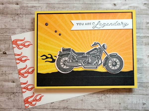 This card uses the Legendary Ride stamp set and coordinating dies, and the Rays of Light stamp.