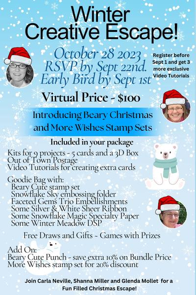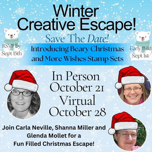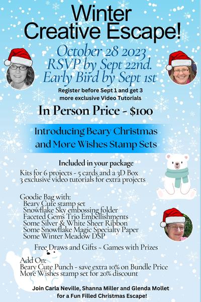 until September 1st EMAIL ME to register today or click the link below!    WINTER CREATIVE ESCAPE  Registration is open now until Sept 15th.  In Person - October 21 Virtual - October 28     We will be using the Beary Wishes (think cute Polar Bears) and More Wishes (a sentiment set that is amazingly versatile).   Click on any of the pictures to Register today, or EMAIL ME if you have any questions or want to register.  And, yes, there is an option to join me Virtually if you live outside Canada as well, contact me for that information.  IN PERSON EVENT