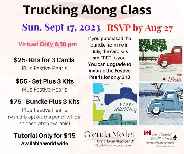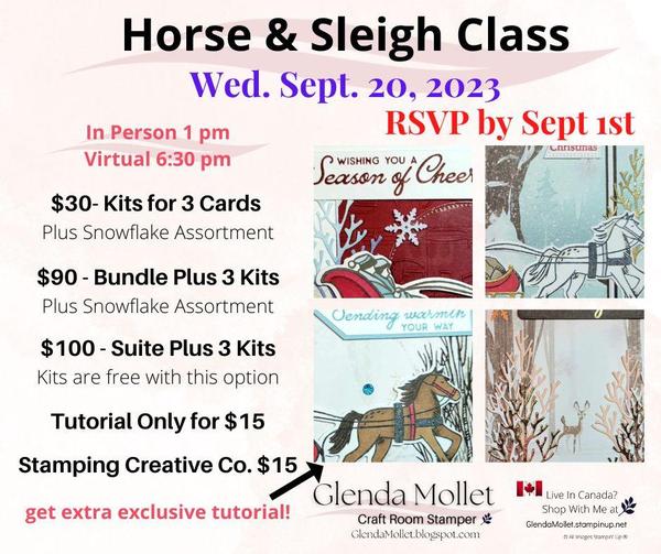 CLASS 5 Days left to Register  You May Qualify To Get This Class for FREE!    Anyone who purchases the Trucking Along bundle from me in July or August will automatically qualify for FREE access to this cute class. You will receive the kits for all 3 cards, plus the exclusive PDF with all the measurements and Video Tutorials.  I know the punch is not available right now, but EMAIL ME and I will put you on the Wait For The Punch list, which will qualify you for the FREE Class kits, and I will honour the 10% Bundle Savings on the punch and stamp set!  Registration is only open until August 27th. EMAIL ME to register today or click the link below!    HORSE & SLEIGH CLASS 10 Days left to Register  First Christmas Card Class of the year!   This month the class will include 3 cards and for those who are in the Stamping Creative Co., you will get a 4th exclusive tutorial!  Registration is only open