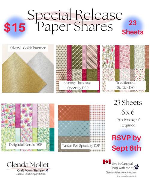 for only $25 (plus postage if applicable)  AND sign up for BOTH shares and get a free package of Adhesive-Backed Glitter Sequins for FREE from me!!!  And, Stampin' Up! is releasing brand new, unpublished designer papers on September 6th. So I have added an option for those as well. You can see that information below.    Special Release: New Designer Series