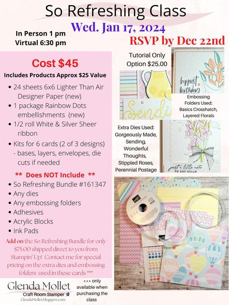 The new mini catalogue will be available for you to order from on January 4, 2023 and I am so excited!  Classes have been set for January to April 2024, you can find that information in the video below, and I will be announcing it soon in my newsletters.  If you have purchased from me in the past 12 months, I will automatically send you a brand new copy of your very own! If you are a Demonstrator, you have access now on the Stampin' Up! Demo website.  If you would like to request a Canadian Catalogue from me, click the