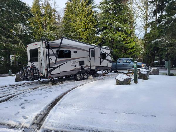 spring camping trip! It's a bit different than we have experienced before, because March really came in like a lion! The road through the mountain pass was awful, but not until we were beyond the last turn around area for pulling an RV. So we persisted, and carried on anyways. There were several (8 to be precise) vehicles in the