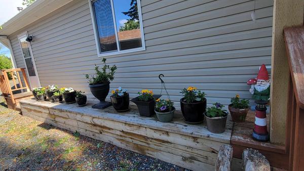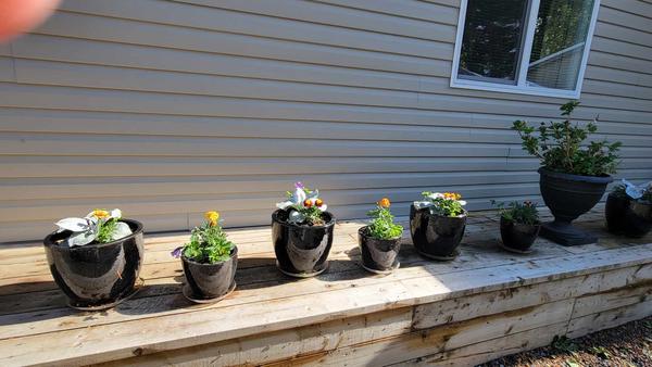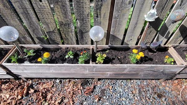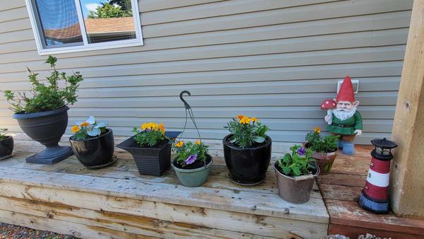 Here's some pictures of my plant pots and garden boxes that were planted this weekend. Marigolds, Zinnias, Petunias, 2 cucumbers, 1 zucchini, 4 tomatoes along with the already planted Hydrangea, a Mother's Day gift from my children/grandchildren a few years ago. Â
