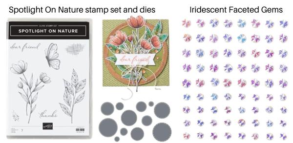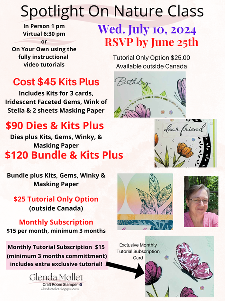 The class includes a full package of the brand new Iridescent Faceted Gems, a Wink Of Stella Glitter Pen and 2 sheets of Masking Paper along with the kits for 3 cards. Plus you can add the Spotlight On Nature dies or add Spotlight On