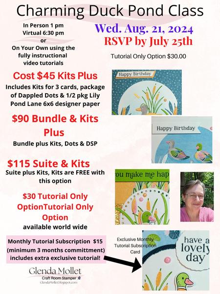 CHARMING DUCK POND AUGUST CLASS & MONTHLY TUTORIAL SUBSCRIPTION  Class Date:  Wed. August 21st RSVP Date: July 25th  Oh. Goodness!  This bundle is SOOOOO cute. I know you are going to love creating with it.  You will need the bundle to create the cards as designed, but alternative products may be used too. I designed 4 super cute cards, 3 for the class and 1 exclusive card for the Monthly Tutorial Subscription