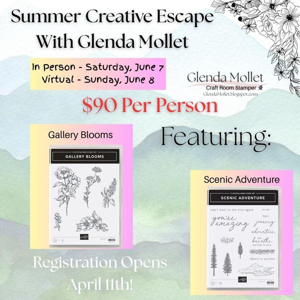Whether you're joining us in person in beautiful Port Alberni, BC, or tuning in from the comfort of your own craft space, this is the event you won’t want to miss. We'll be featuring the gorgeous Scenic Adventure and Gallery Blooms bundles to create six stunning cards designed to spark your creativity and make your summer crafting shine.