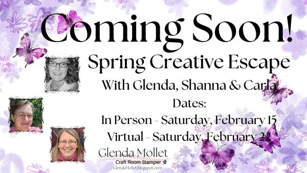 types, white on white with a pop of colour. I will be live on my page, in my VIP Group, in our Creative Escapes group and on YouTube. Hope you can join me in one of those spots! Facebook Page https://www.facebook.com/InMyCraftRoomStampingWithGlenda Facebook VIP Group https://www.facebook.com/groups/1148180145565229 YouTube Channel https://www.youtube.com/c/GlendaMollet Creative Escapes! Group Saturday My very first Scrapbooking Live will hit the airwaves at 7:30 pm (PT). Join me in all the places (listed above except the Creative Escapes! group)