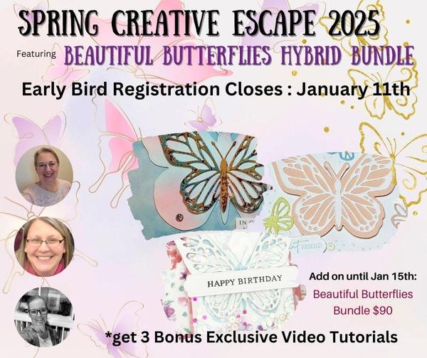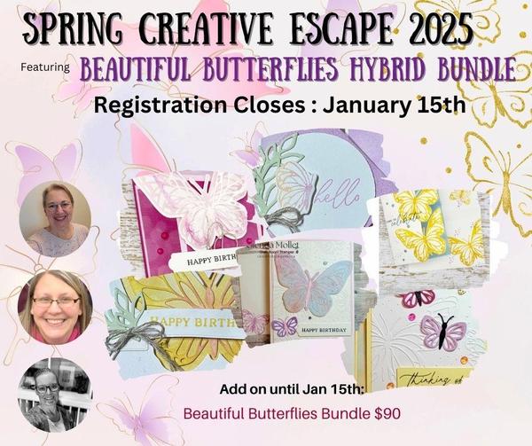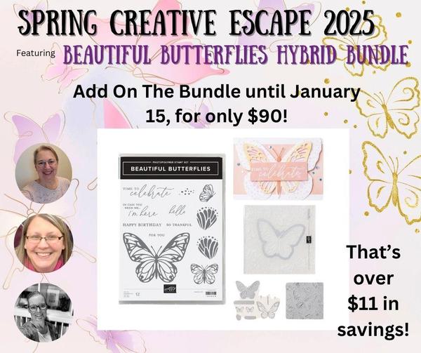 don't share anywhere else. If you are already a member, CLICK HERE to go directly to the post on facebook... Friday, January 3, 2025 Another live stamping demonstration, this time I used the Beautiful Butterflies bundle, which is the featured bundle for our Spring 2025 Creative Escape!
