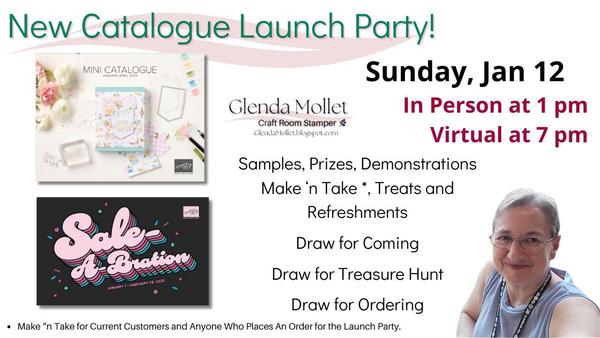 products coming. And there is a new Scrapbooking Brochure with over 30 new products! Have you been doing the math? Yup, that's over 160 new products coming your way. I don't have all of them, but I have a few, and I have also participated in a couple of swaps which, if the cards arrive in time, will give me even more samples to show you. Date: Sunday, January 12 Time: In Person Drop In from 1 to 4 In My Studio Virtual on facebook and youtube starting at 7 pm (all times are pacific time) RSVP: By tomorrow, Wed. Jan 8th, if you would like a make 'n take kit There will be product showcases, projects, food and refreshments (in person event) 3 draws and, of course, a make 'n take kit available to all my current customers, and anyone else who places an order at the event (in person or virtual). The draws are Just For Coming, Placing An Order, and Completing the Treasure Hunt. CLICK HERE to download the Treasure Hunt, complete it and send me a picture and I will enter you into the draw. You don't have to be in Canada, you don't have to be a customer, you just have to complete the form. There will be a prize! CLICK HERE to email me to let me know you are coming to
