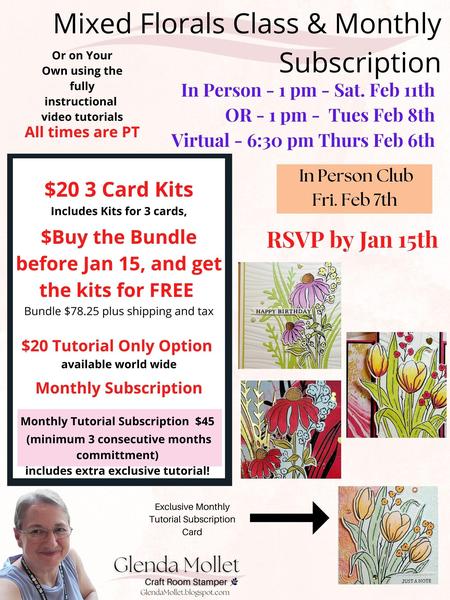 Mixed Florals Class and Monthly Tutorial Subscription RSVP by January 15th I have the next new class ready to go, and let me tell you, it is fabulous. The Mixed Florals bundle is coming as of January 7th, with the release of the new Online Exclusives. It is part of the Mixed Media Florals Suite, which consists of the Mixed Florals bundle, Mixed Labels bundle, Plaster Painting embossing folder, Low Profile Dots, and Mixed Media designer paper. You can see pictures and details below in the Online Exclusives Coming Soon section. There are 4 different ways to enjoy my next class, and you will notice some changes in the offers and pricing. - Option #1 - $20 for kits for 3 cards - complete with papers, embellishments and envelopes (only available in Canada)