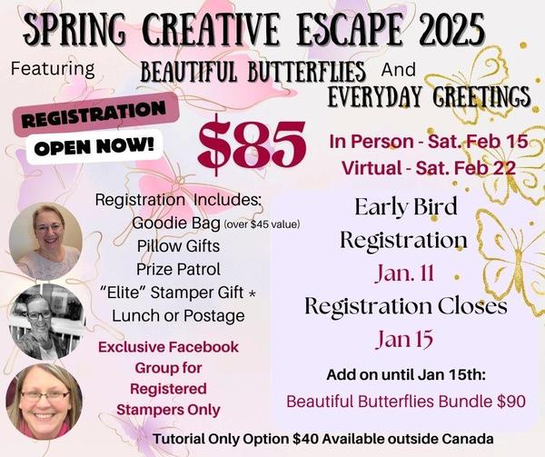 food and beverages, the Virtual class will include postage from me to you, and some yummy goodies as well. There is an exclusive Spring 2025 Creative Escape facebook group for everyone who registers. There will be exciting stuff happening in that group starting January 16th once registration closes. If you live outside Canada you can choose the Tutorial Only