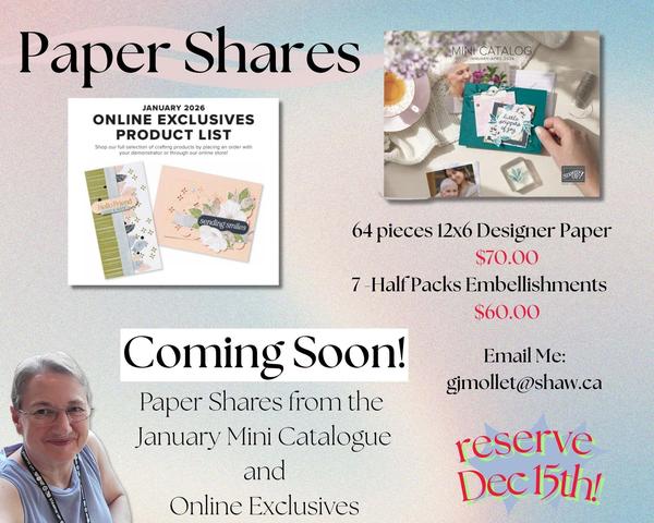 got great news for you! My Paper and Embellishment Shares for the January release will be opening soon. This is the perfect way to get your hands on a little bit of everything in the new catalog without committing to full packs.