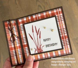 Prairie Grass and The Right Words stamp sets, along with Gathering Together Specialty Designer Series Paper. I’ve combined Early Espresso and Cajun Craze inks for rich, autumnal colours, while the retired Brushed Metallic Adhesive Backed Dots and Early Espresso Baker’s Twine add just the right finishing touch.Â