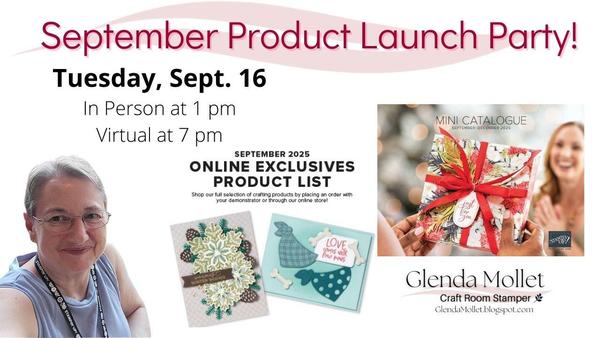 join me at my Catalogue Launch Party on Tuesday, September 16. If you’re local, the In Person event will run from 1 to around 4 pm, and we’ll have plenty of time to visit, check out new products and samples, and enjoy a special make n take using some of the exciting new items. I’ll also have three draws happening—one just for coming, one for completing the Treasure Hunt, and one for placing an order.
